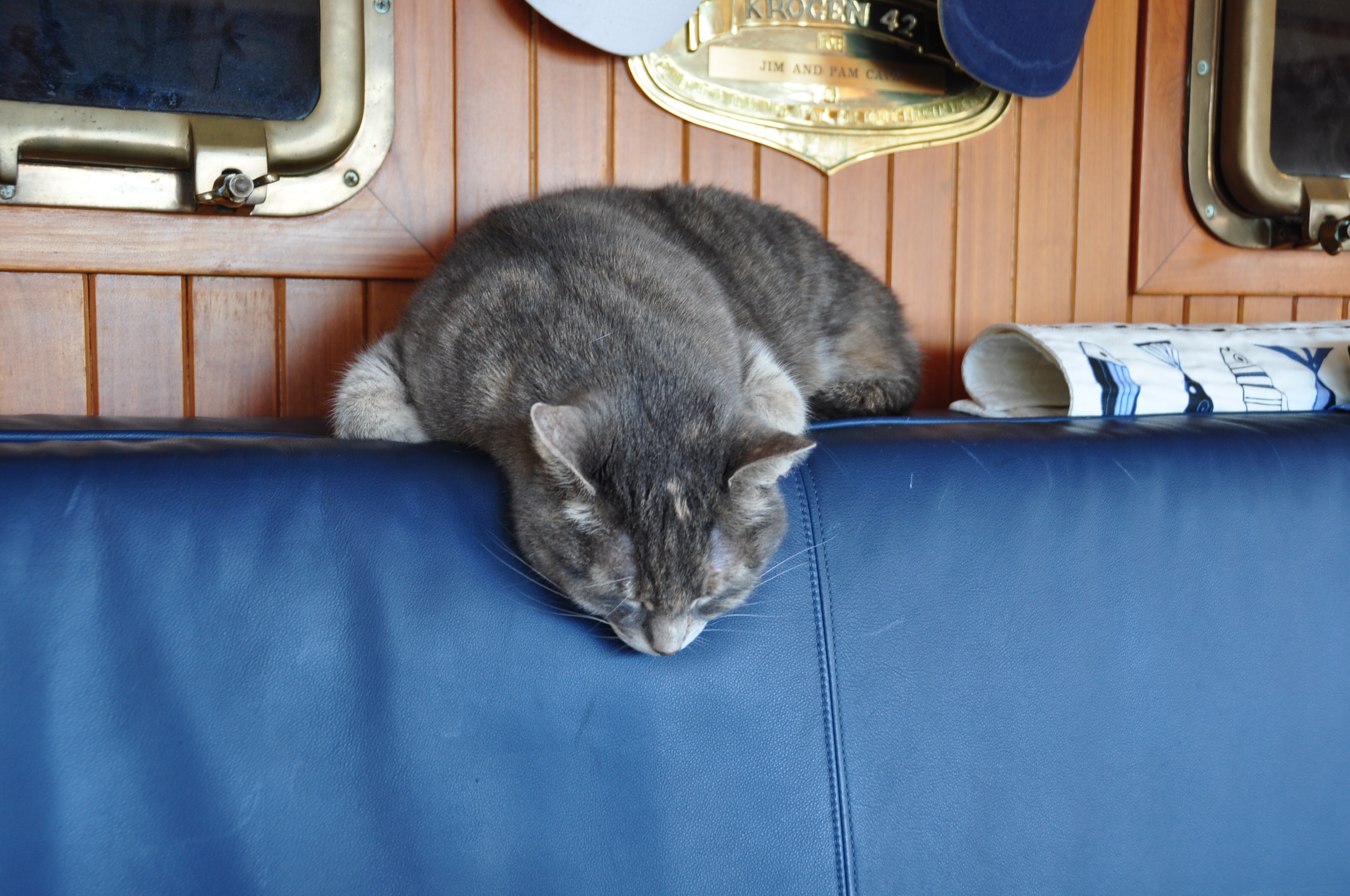 I feel this warm wet liquid. Poor Lilly – she peed — Poor Pam – she peed all over me! All over the cover on the of the seat. She was squirming to get down but I was holding and we were rolling. Ok. I’m wet – smell like cat pee. Clothes need to come off. The cover of the seat needs to come off. I’m holding on because we are tossing around in 2 metre seas. Feels like more! Poor Lilly. She jumps down and poops. This is all happening because she is very sea sick .