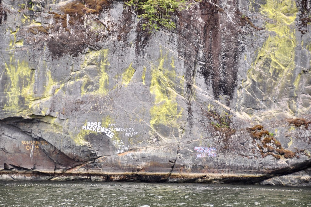 A rock cliff with the names of tugboats that have been painted there by the tugboat captains over many years