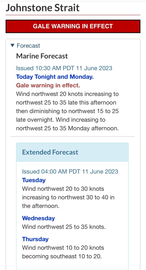 Johnstone Strait can be pretty nasty when the wind is up. And then sometimes it’s like a calm glassy lake. Looks like it will be at least Thursday before we go there ! Wind and tide makes our plans ! I’m thinking it could be – poor Lilly !