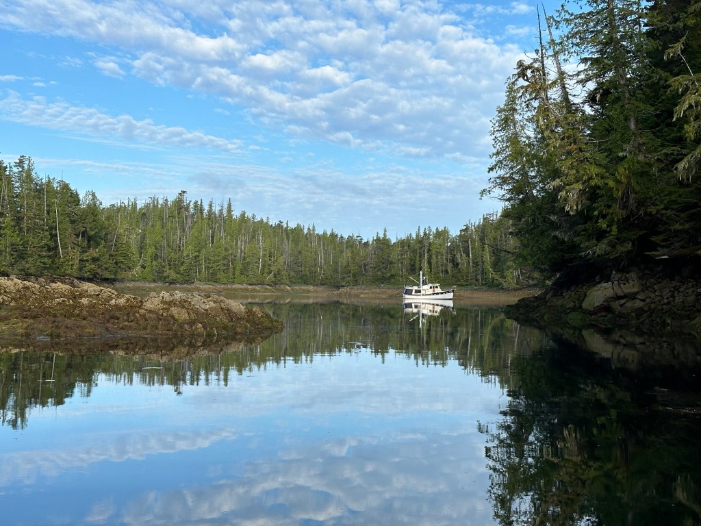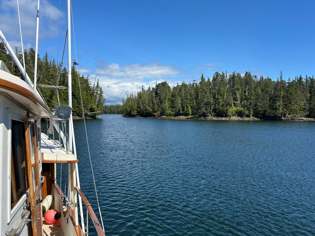 We had a pretty uneventful motor to Klemtu except for a bit of a swell that happens in Seaforth Chanel which is open to the ocean. Lilly has been pretty mellow the last few days quietly resting in her little soft sided crate. And not much barfing either.