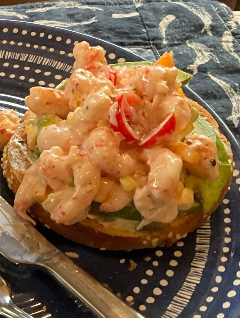 We enjoyed a bagel with avocado and prawns for dinner