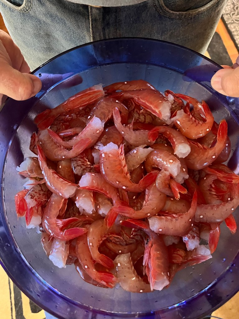 We stayed two nights in Codville and pulled the pots twice. We got about 200 prawns. Jim was happy.