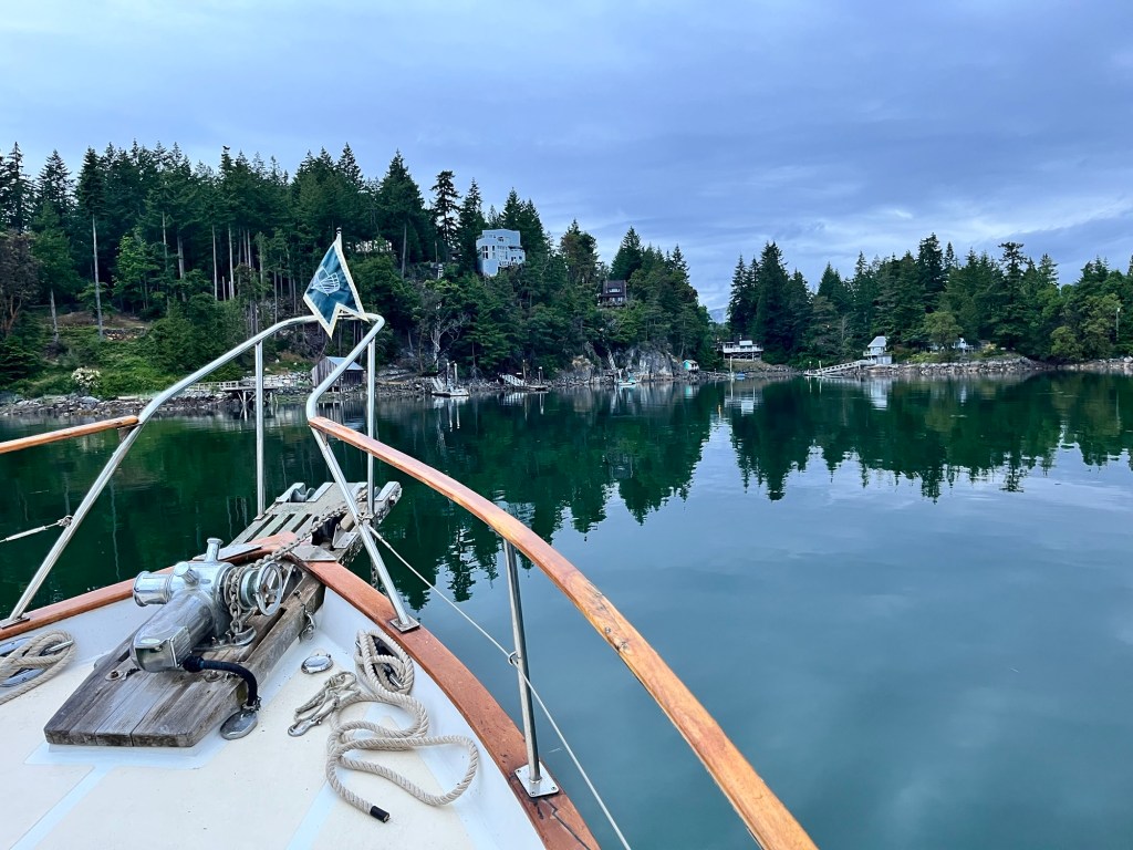 We stopped at the dock at North Thormanby Island to say hello to an old friend of Jim’s and his wife. Guy had never been on the boat so Jim gave them a quick tour and I enjoyed hanging out on the dock with their lovely Standard poodle – Georgia