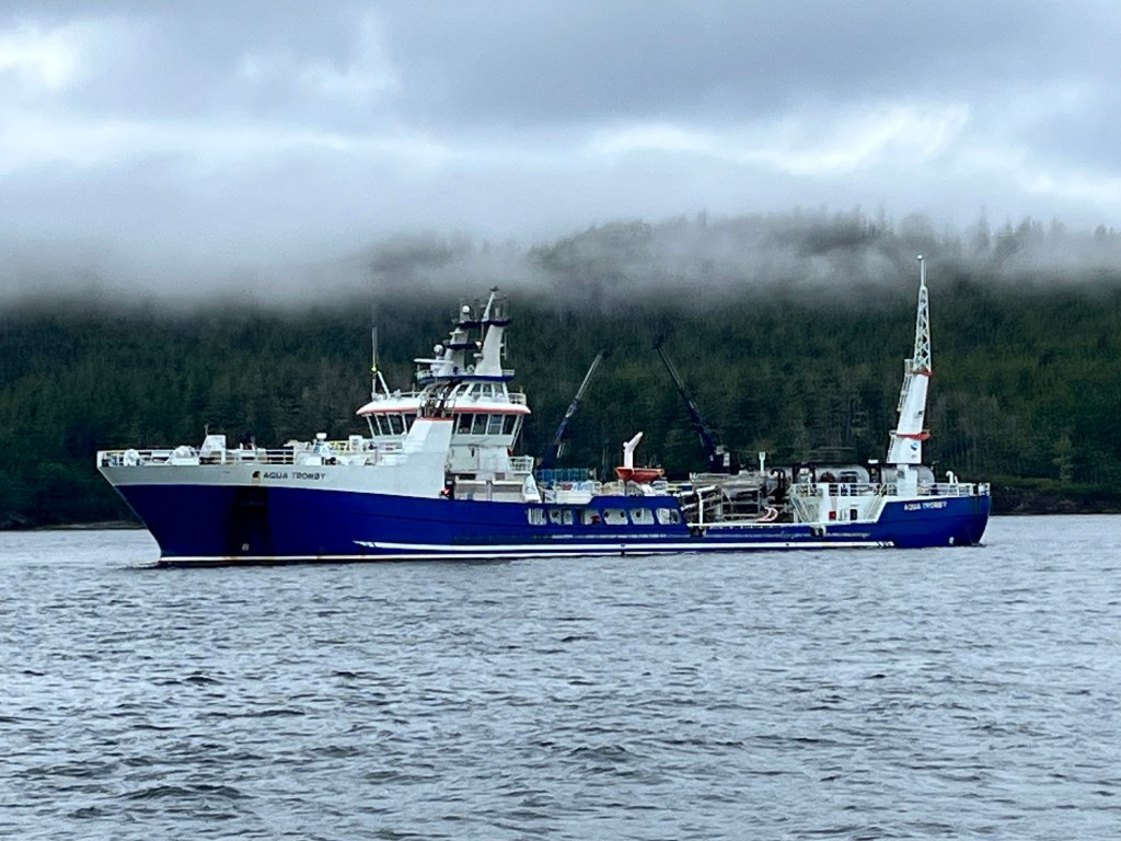 Anchored up just off Bull Harbour was the big sea lice cleaning ship. There are a couple of fish farms in the area.
