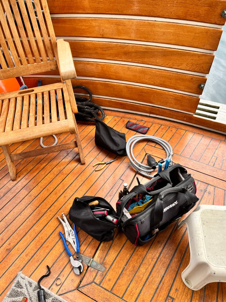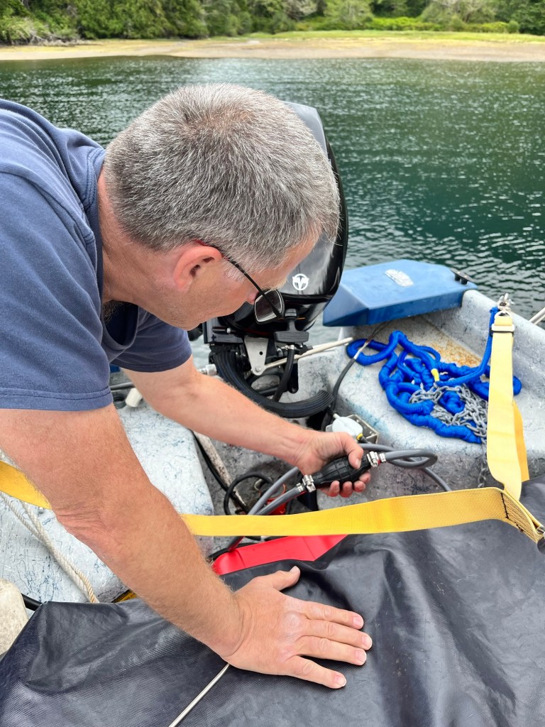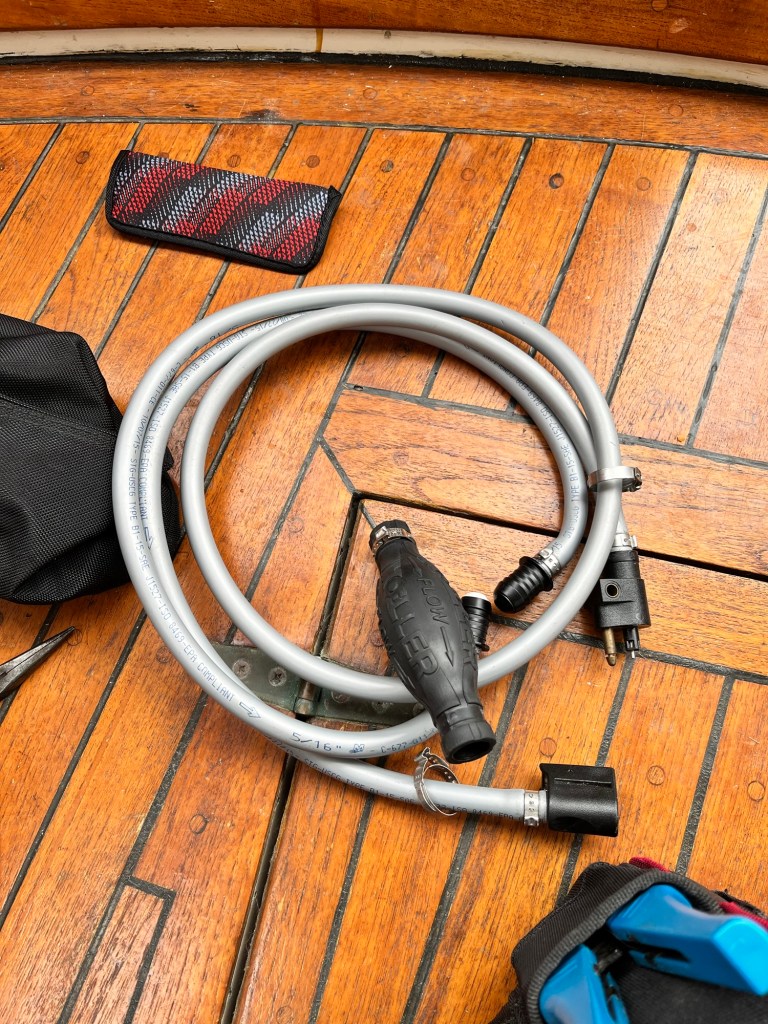 So. Fortunately Jim found a new gas line that he had bought with a tank in Sandspit in 2017. It never had the right connection for the outboard engine. But for some reason he kept the line on the boat.