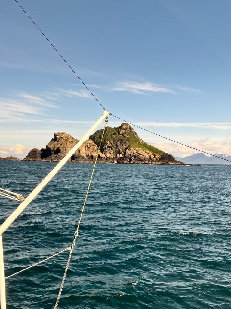 It was early. The weather and seas were unremarkable so instead we just carried on around Brooks. Lilly was medicated.