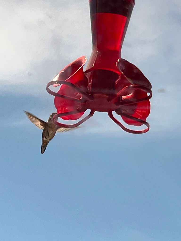 The hummingbird feeder has been a big success. Yesterday it was just two birds – one female on one male Rufus. Today there is a third males and one small female – or a juvenile.