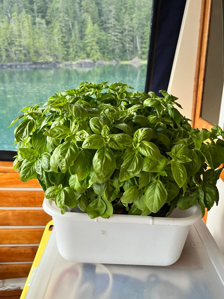 I have to keep moving the basil around. If Lilly is out in the cockpit with the basil – she eats it. And then we have cat chewed basil for our pasta !