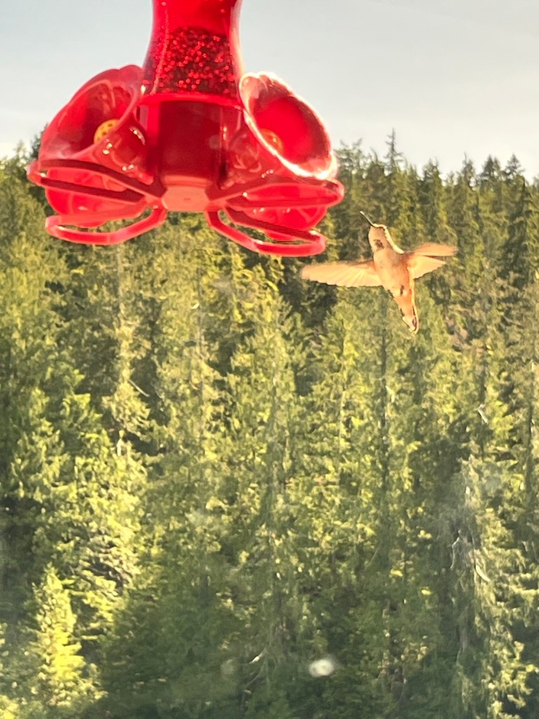First thing we did was put up the hummingbird feeder. Very soon after a little female showed up. Then a male. They must send the females out first – to check on the situation.
