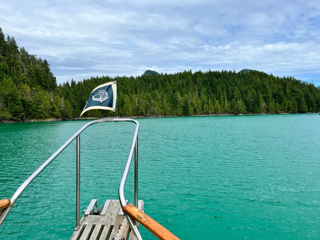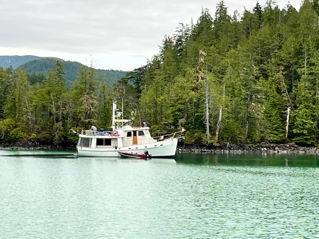 We motored out of Dixie Bay and as we were getting closer to Rugged Point the wind and the surf and the rain started to really pick up. So we have decided not to go out in the miserable weather. We turned around and came back to a little anchorage up Kashutl Inlet called Hankin Bay. We think it’s a pretty little spot but it hard to tell it’s raining so hard !