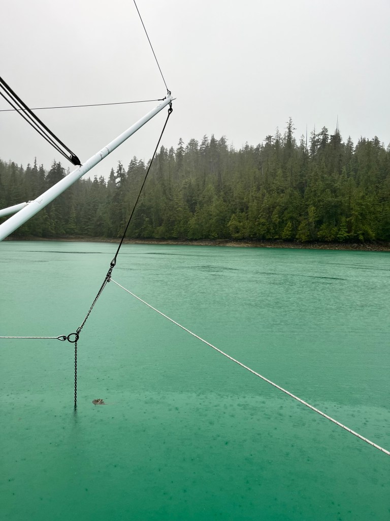 It was raining so hard we needed to wear our wet gear to pull the anchor.