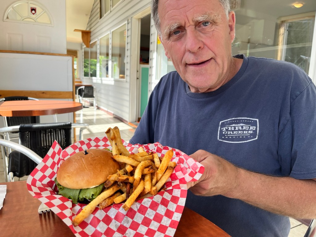 We enjoyed the meal so much we went back for another meal a couple nights later. I had the chicken burger – always a bit of a risk that the chicken is dry and tough. But it was not! It was moist and also had fresh tomato and lettuce and onions. The onions really added to the burgers!
